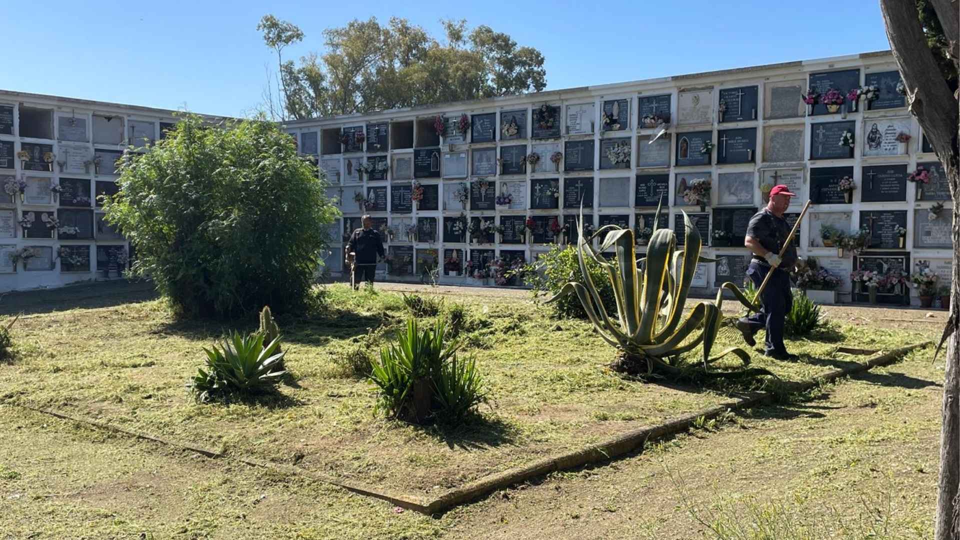 Dentro de este dispositivo, el Ayuntamiento ha intensificado los trabajos de limpieza, jardinería y mantenimiento del recinto. Se han realizado labores de poda de adelfas, corte de setos, limpieza de palmeras y retirada de residuos vegetales, además del desbroce del perímetro exterior y del aparcamiento.