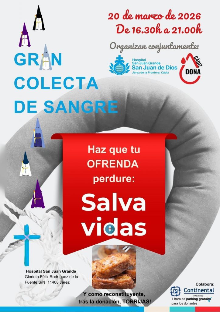 Bajo el lema “Haz que tu ofrenda perdure: salva vidas”, la convocatoria apela directamente al compromiso del ámbito cofrade jerezano, invitando a transformar la devoción en un acto tangible de ayuda a los demás.