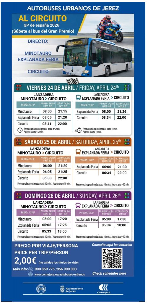 El Ayuntamiento de Jerez pondrá en marcha un operativo especial de transporte público con motivo del Gran Premio de España de Motociclismo, que se celebrará en el Circuito de Jerez-Ángel Nieto entre los días 24 y 26 de abril. Este dispositivo incluye más autobuses lanzadera, ampliación de horarios y aumento de frecuencias, con el objetivo de mejorar la movilidad ante la llegada masiva de aficionados.