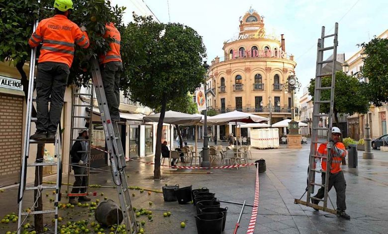 Los trabajos se iniciaron este lunes en la calle Lancería, y se extenderán en las próximas semanas a otras zonas de la ciudad y a las localidades rurales. Según datos del área de Medio Ambiente, Jerez cuenta con unos 10.000 naranjos distribuidos por su término municipal.