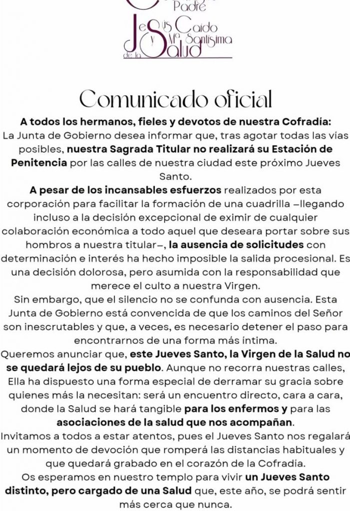 La cofradía de Nuestro Padre Jesús Caído y María Santísima de la Salud de Lucena (Córdoba) ha anunciado oficialmente en sus redes sociales que su sagrada titular no realizará la Estación de Penitencia por las calles de la ciudad el próximo Jueves Santo, una decisión que llega tras no haberse podido formar una cuadrilla de costaleros para portar el paso.