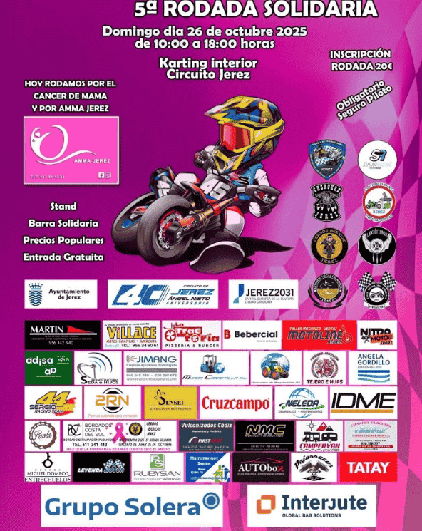 Esta jornada se desarrollará en el Karting interior del Circuito de Jerez Ángel-Nieto de 10:00 a 18:00 horas, un evento solidario en el que se podrá disfrutar del apasionante mundo del motor a beneficio del cáncer de mama y AMMA Jerez.