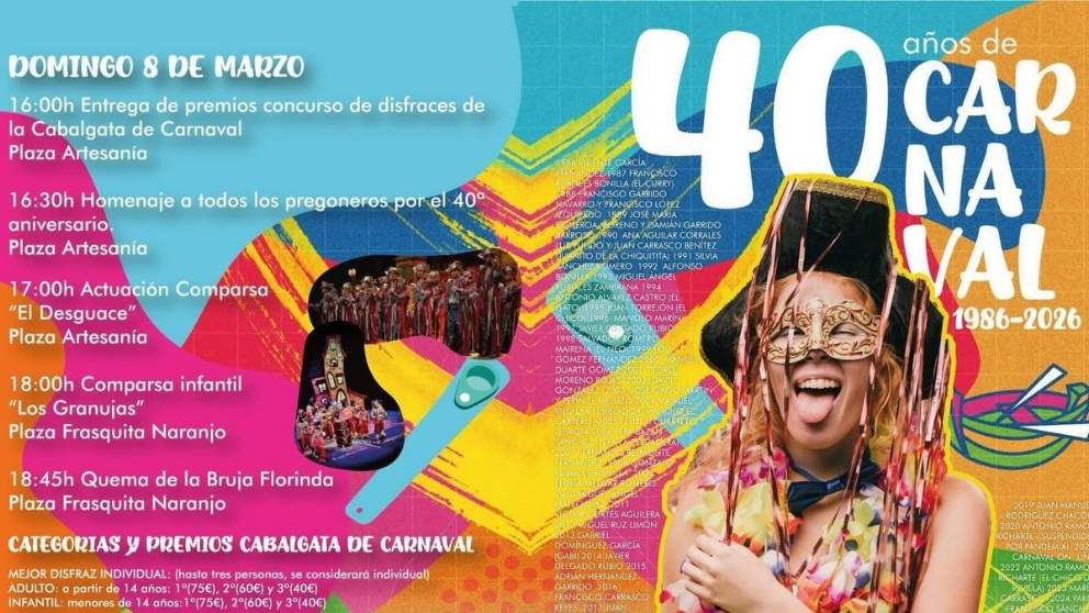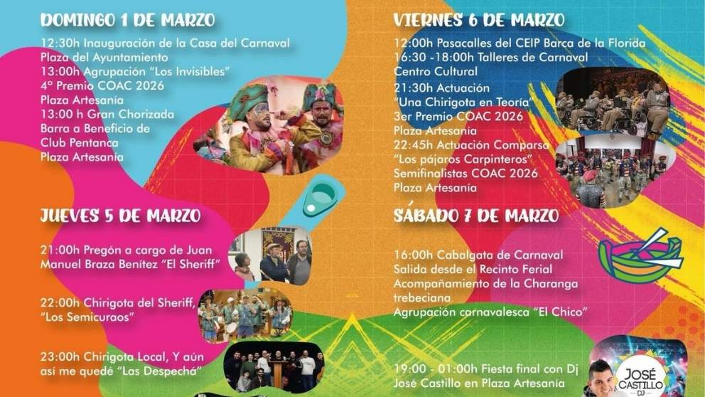 El Ayuntamiento de La Barca de la Florida ha anunciado en sus redes sociales la programación oficial de 2026, que se celebrará del 1 al 8 de marzo, invitando a vecinos y visitantes a vivir una edición muy especial: coplas, disfraces, convivencia y un ambiente festivo lleno de actividades para todas las edades ¡y para los aficionados al 3×4!